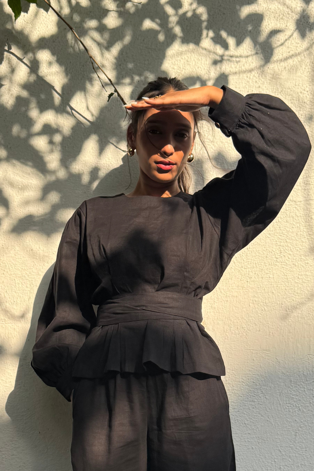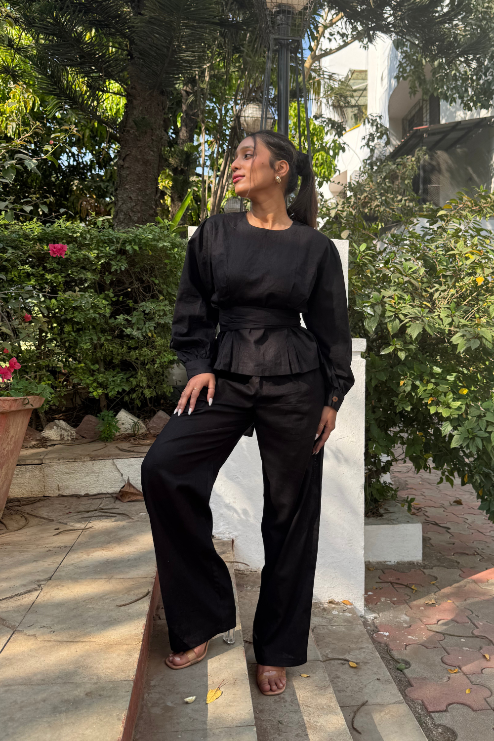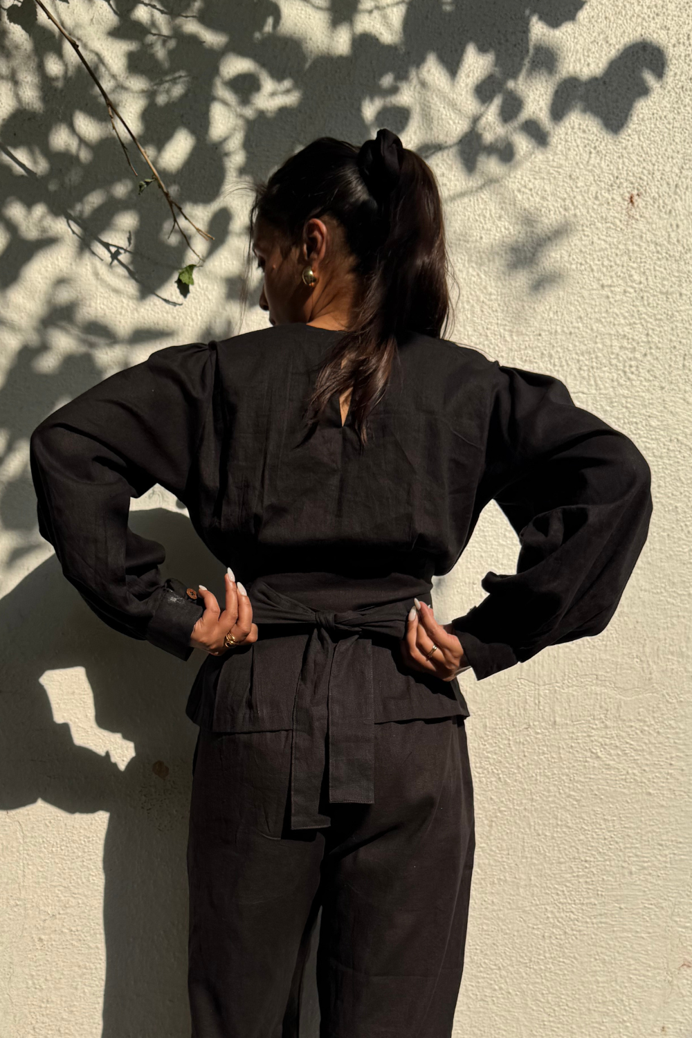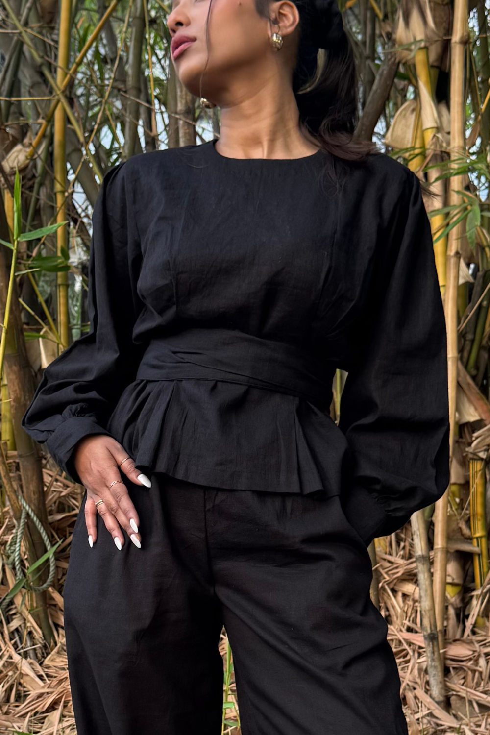 A timeless black essential, designed for the bold, the confident, and the effortlessly stylish. The Black Haze Top is crafted from our breathable, eco-conscious hemp-cotton blend—offering structure with softness in all the right places. With full sleeves, gentle garter cuffs, pintuck detailing at the waist, and an adjustable tie-up belt, it flows with your rhythm—chic, grounded, and endlessly wearable.