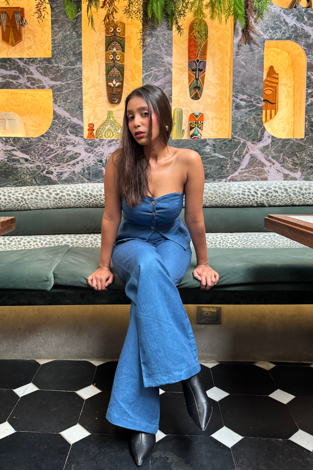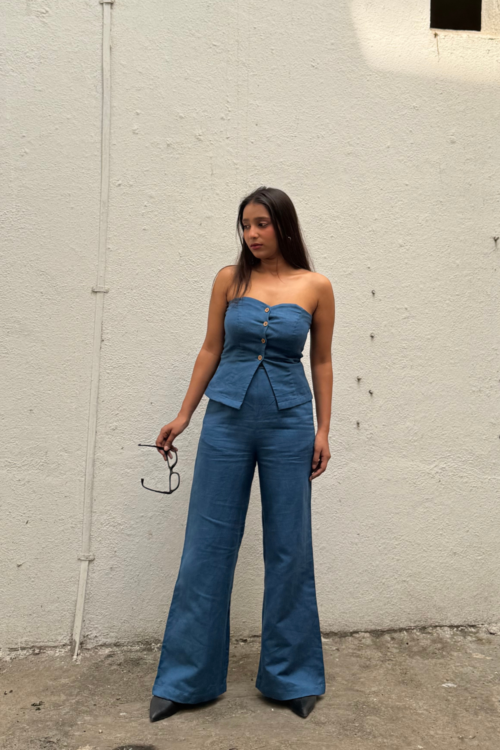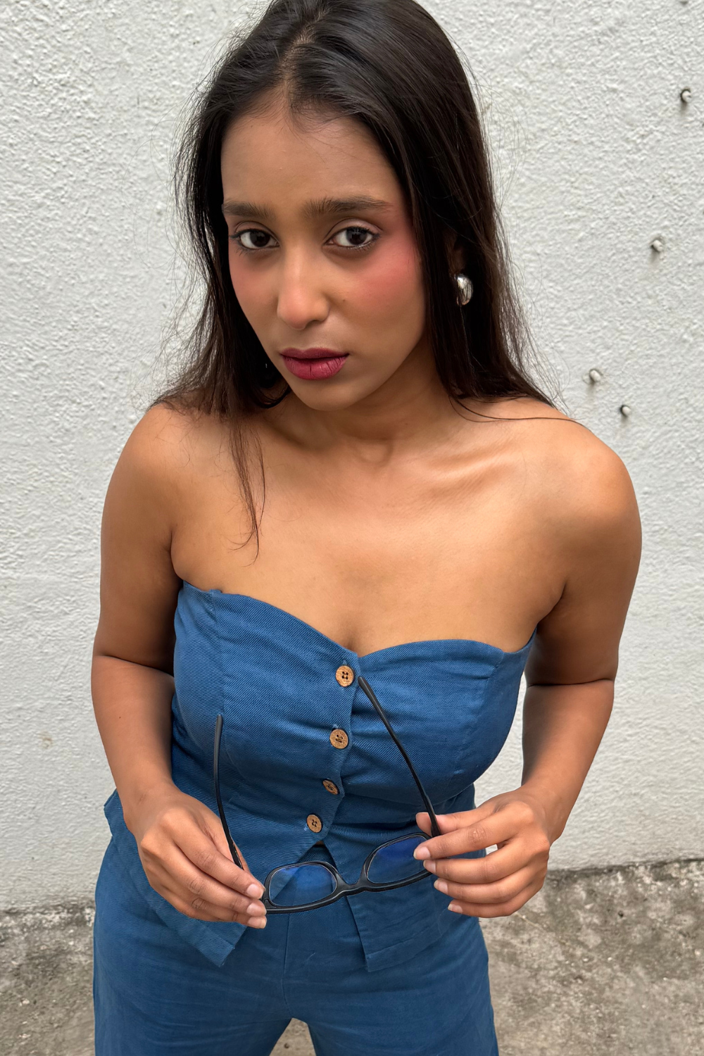 Inspired by classic corsetry, the Blue Candy Top features a delicate sweetheart neckline and off-shoulder silhouette for a soft yet bold look. Handcrafted by local artisans, it's made from a breathable hemp-cotton twill with a pure cotton lining, giving you comfort, structure, and conscious style in one.