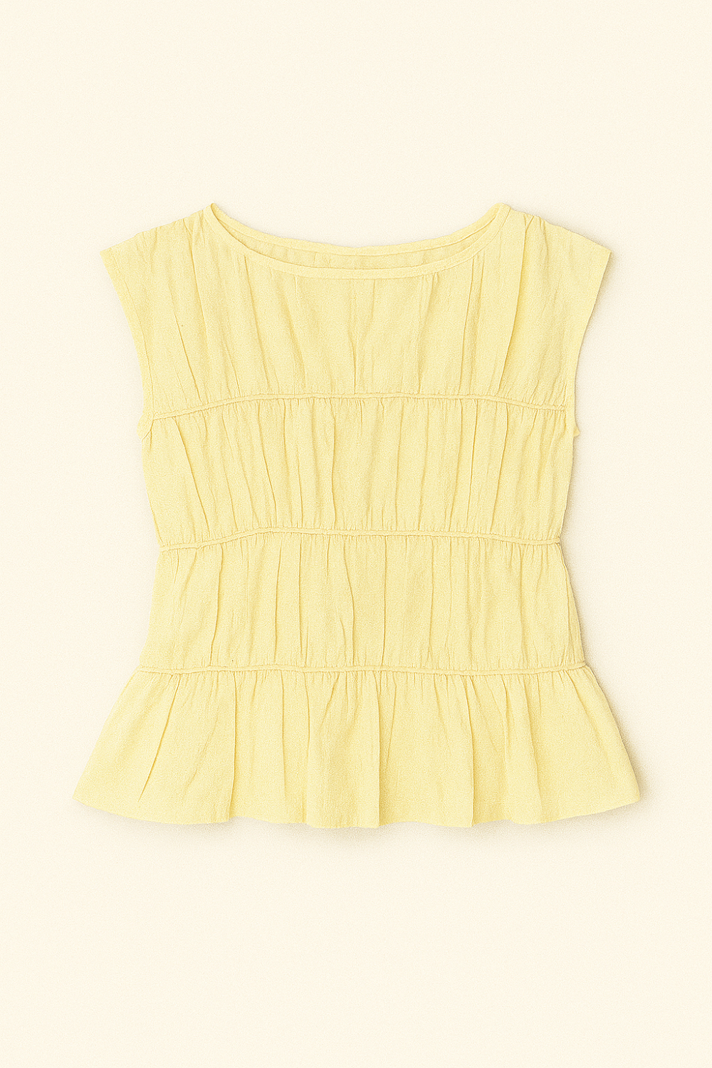A soft, loosely gathered silhouette in a warm yellow hue, made to feel like a breath of fresh air. With dropped cap shoulders and a relaxed fit, the Butter Yellow Top brings ease to busy days and quiet confidence to your wardrobe.
