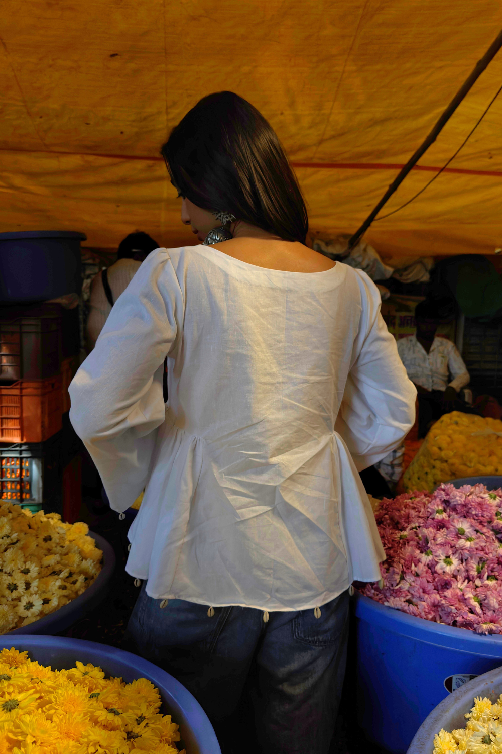 White loose-fit short kurti with a flirt neck and bell sleeves, detailed with handcrafted shell tassels. Made from soft, sustainable fabric that feels light on the skin. You’ll feel calm, confident, and effortlessly beautiful every time you wear it.