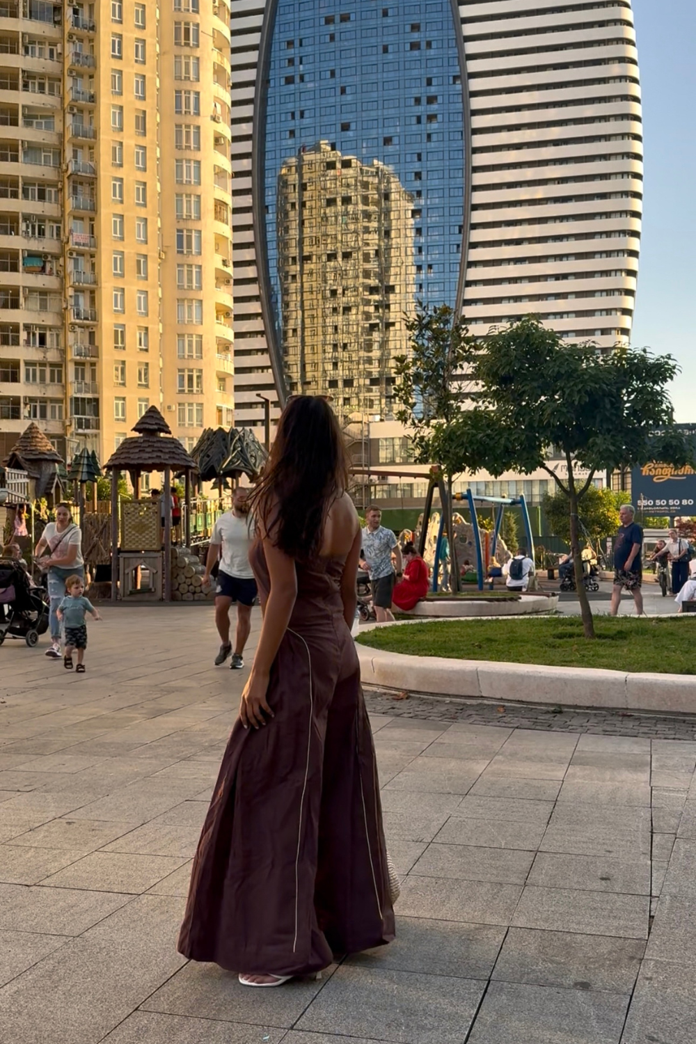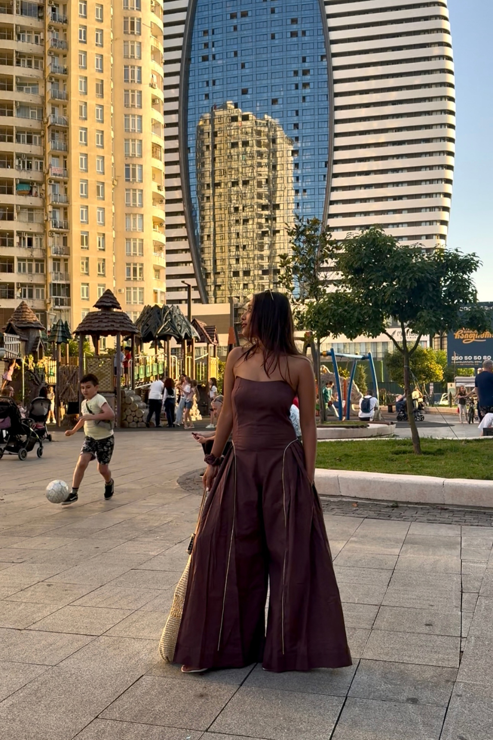 A bold blend of structure and softness. The Chocolate Diesel Jumpsuit is designed to make an entrance. With a pointed corset-inspired neckline, sculptural side gathers, and a sharply tailored silhouette, it delivers drama without saying a word. Crafted in a rich mocha brown hemp-cotton blend, it features a fitted bodice, side pockets, and a concealed back zip for a clean finish.