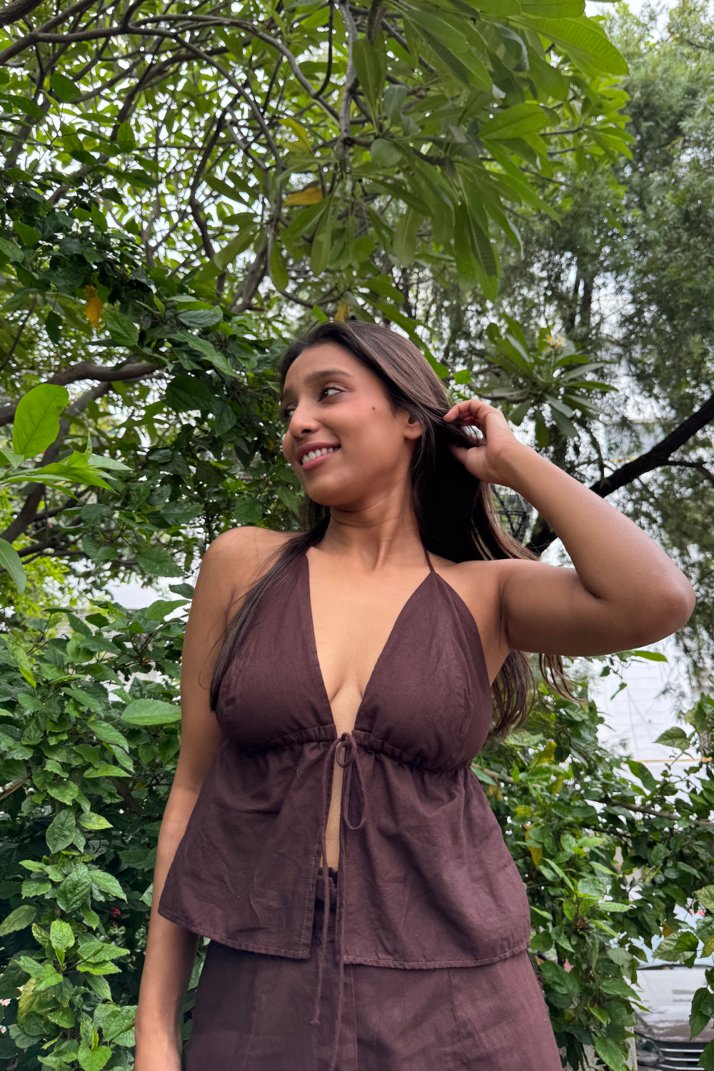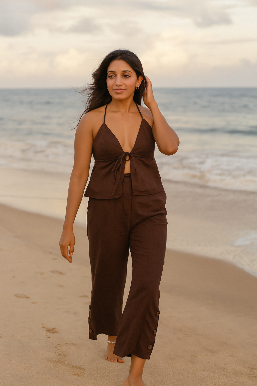 Espresso Haze isn’t just a co-ord—it’s your bold soul, tailored. Crafted in a rich mocha hue, this set pairs fearless expression with quiet sophistication. The crop top features a front-open neckline with adjustable string ties and a soft elasticated back for the perfect custom fit. It reveals just enough, with confidence stitched into every seam. Paired with mid-waist structured pants designed with a clean 2-inch waistband and front fly zip, the silhouette is sharp yet easy.