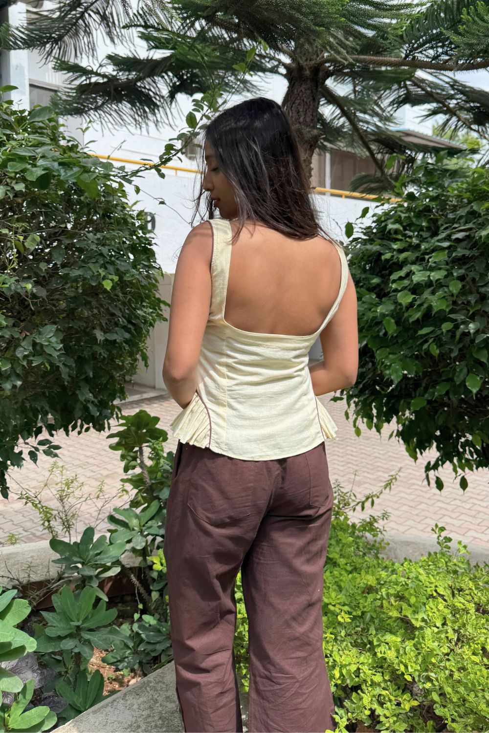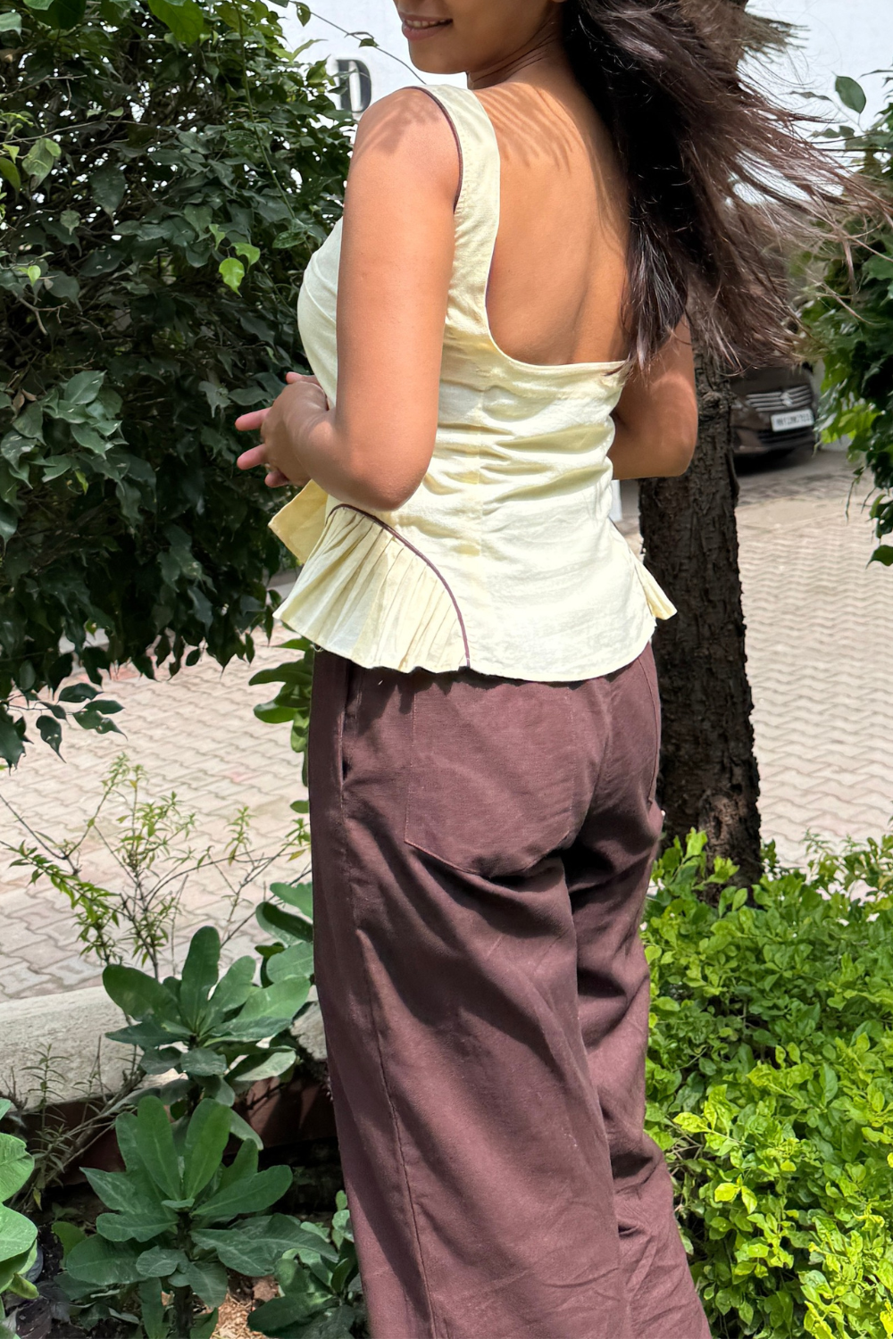 This is simplicity, elevated. The Yellow Fruit Stripe Top is crafted in a breathable hemp-cotton blend and cut in a flattering square neckline with tailored side pleats. The clean piping, structured waist, and old-money elegance come together in a soft butter yellow, evoking warmth, grace, and quiet power.